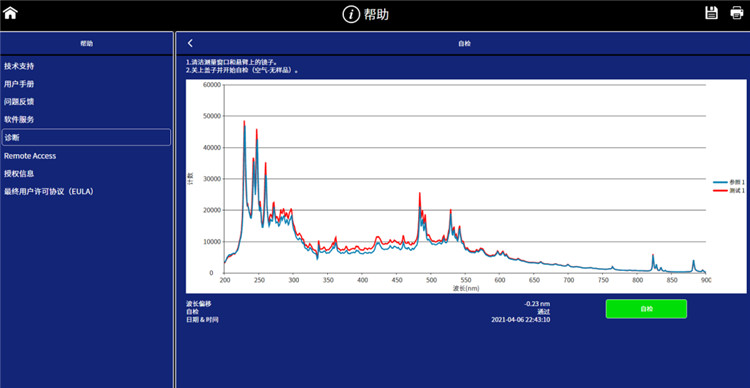 NanoPhotometer?在每次開機時都會對光源強度進行檢測,初始化通過即代表光源已進入工作狀態。在使用過程中,也可以通過光譜診斷功能,實時地進行光源性能檢查。空白測量和基線穩定性對于超微量而言是重要的,不少日常使用中出現的問題都源自于空白和基線漂移。除了設備自身的診斷功能之外,定期的進行設備的基線穩定性檢查也有助于判斷和基線有關的部件是否正常,如光源、光學路徑和檢測器。
